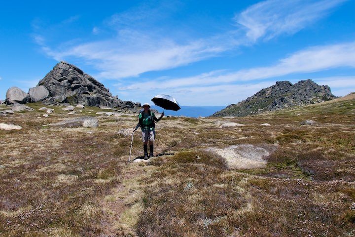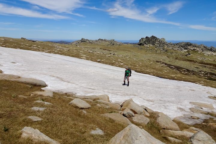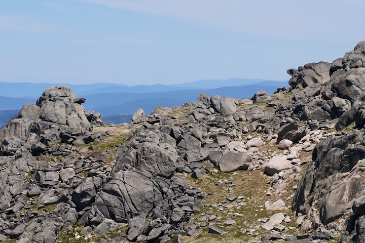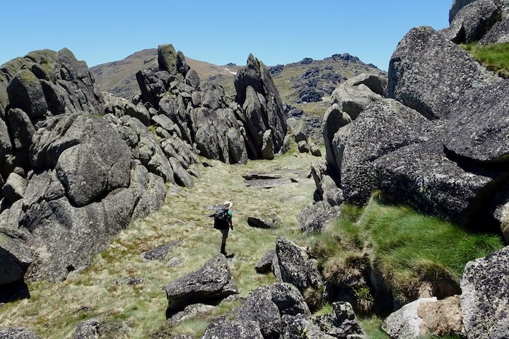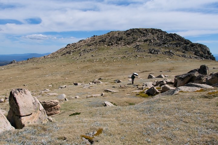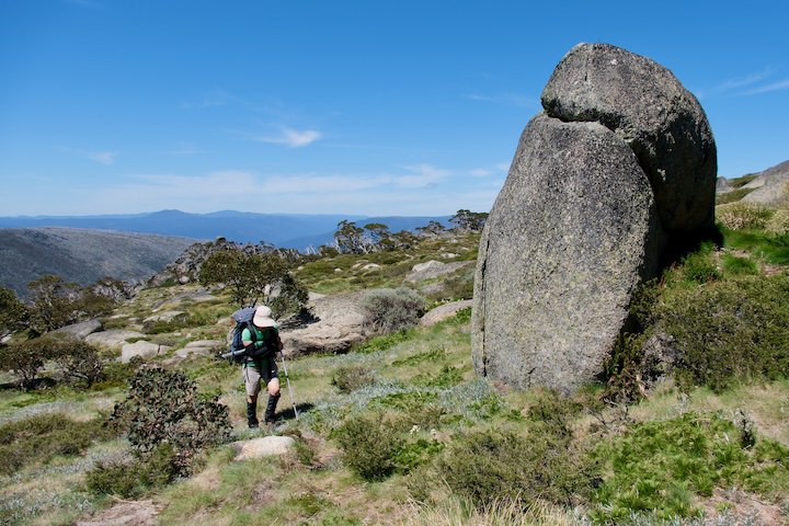 The trees petered out about half a kilometre from the crest of the ridge. We’d be above the treeline for the rest of the walk until we descended again in four day’s time. We followed a foot pad through the grass, picking our way through the boulders. When we reached the ridgetop, the heat of the sun was enough to have us seeking out some shade to drop our packs and cool down for a few minutes.