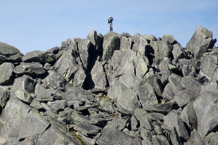 The last of the climb was through a patch of boulders, though far smaller than we’d had at the southern peak. We walked over to the little cross marking the summit, and dropped our packs with relief. Our rest was soon disturbed by the discovery of ants swarming everywhere, so we moved ourselves and our packs out of their reach. At least we had terrific views.