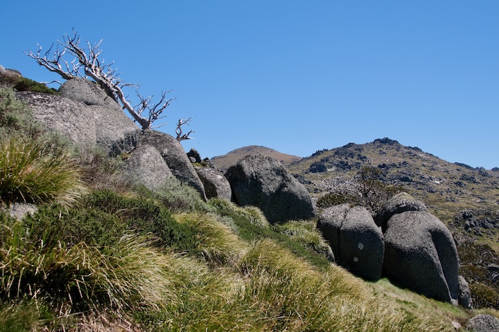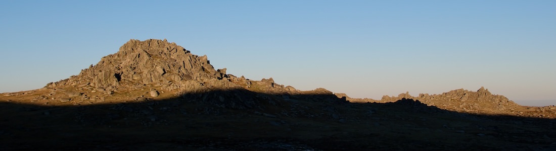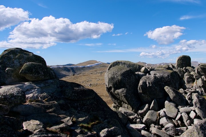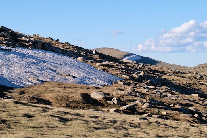 The views were fantastic, spanning the entire horizon. I could see back to where we’d come from (the Rams Head), our route tomorrow (past Kosciuszko), and our future (Kangaroo Ridge). Patches of snow were dotted all along the Main Range, from Kosciuszko to Carruthers Peak and on to Mt Twynam. But everywhere I looked there was one common element: the boulders. On the plains there was a sprinkling of them, while on the ridges and peaks they erupted out in great piles. The low afternoon light accentuated the textures of the landscape. I descended via a more direct route, and returned to camp.