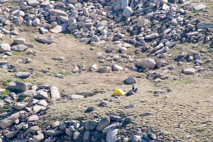 The top of North Rams Head is a giant, chaotic boulder pile, and a lot of fun to scramble around. Last time we were up here, we climbed to a highpoint on the north side. It’s hard to tell where the true summit is, but since the south side faced our camp, I went south today. Our tent was well camouflaged amongst the boulders despite being yellow, with only the sheen of the fly giving it away if you knew where to look. Camp was a touch over 500 metres away, giving me a chance to try hand whistling4, which LS easily heard.