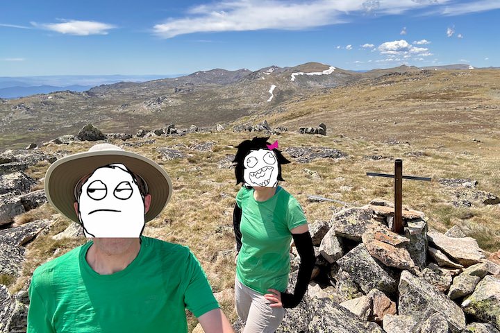 - There is some disagreement over which peak is actually South Rams Head. Some maps give the name to the 2,052 metre peak where we were, while the Geehi Bushwalking Club say it’s the 1,951 metre peak about a kilometre southwest (while another map labels that peak as Rams Head South). See: Spatial Vision Innovations (2009). Kosciuszko Alpine Area Map (1st ed). ISBN 9780980537376. See also: Geehi Bushwalking Club (2001). Snowy Mountains Walks (8th ed). p 76. ISBN 0959965149. ↩︎