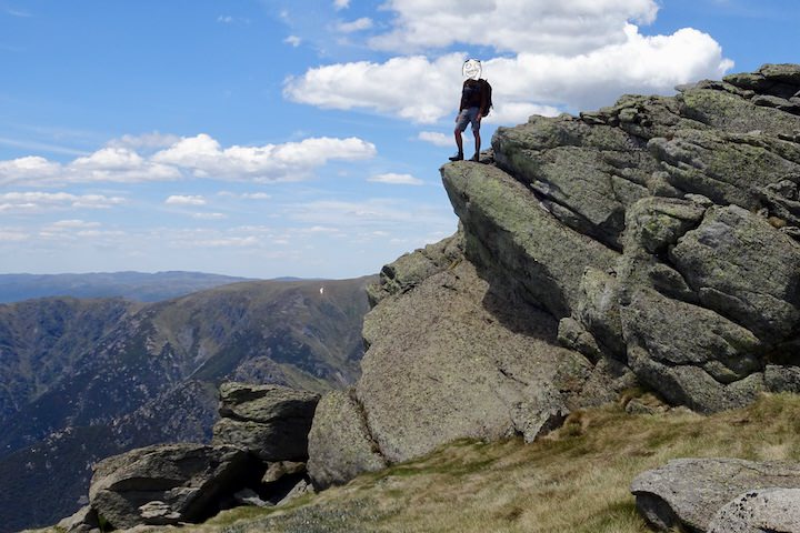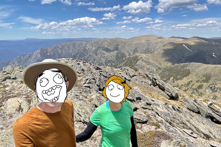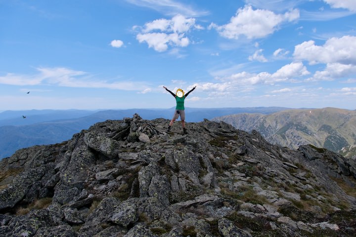 Selfie time at the summit. Tomorrow night’s camp is somewhere above LS’s head on the edge of the range.