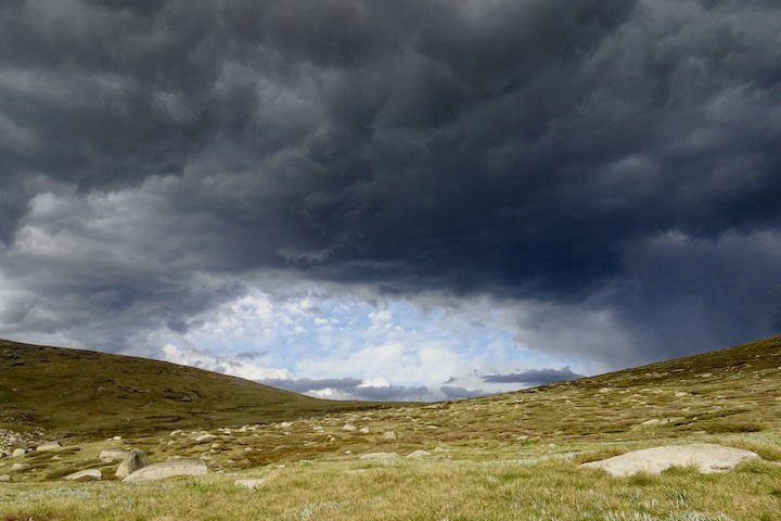 Black clouds were building up above Muellers Pass, and a few rumbles of thunder were enough to encourage us to pack up and get in the tent. It was nice to lie down and relax.