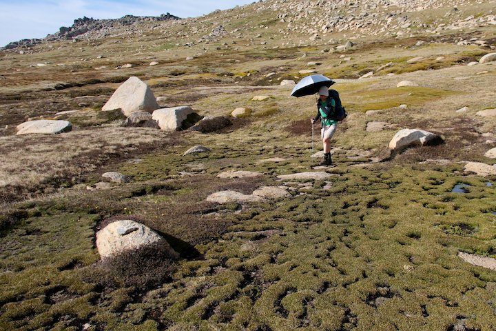 The sun had returned, as had the flies. There was a lot of heat in the sun, and for neither the first nor last time I wished I’d brought my trekking umbrella. While we ate our lunch I suggested we make the side trip up to Alice Rawson Peak. It was a solid walk of about eight kilometres return, but we had all afternoon. LS had been quiet during lunch, but readily agreed. We left the tent wide open to keep it cool while we were gone.