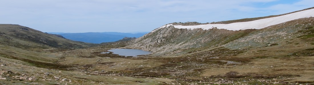 The early sun was slowly being lost to high cloud. Kosciuszko and its cornice were getting much closer, then Lake Cootapatamba appeared below it. The lake looked lifeless and grey until we were well past it, when it caught the reflection of the sky and glowed with a silvery sheen.