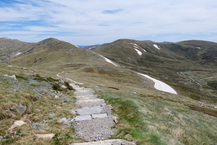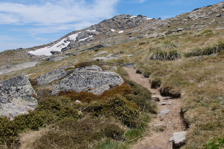 We continued northwards. Below Kosciuszko were a couple of places where the snow had overwhelmed the walking track. We took our time following the line of footsteps left by others, not wishing to provide inadvertent entertainment for the tourists by sliding down into the valley below.