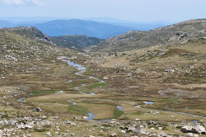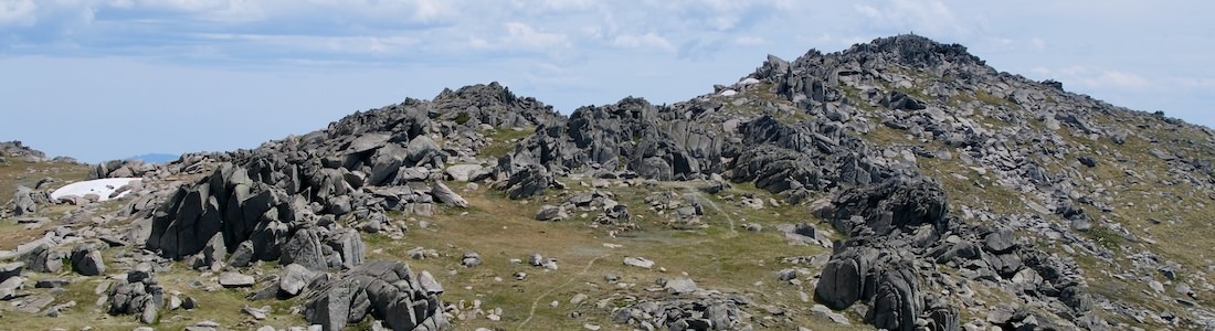 Much of tomorrow’s route was visible: the track from Muellers Pass running above the gleaming Lake Albina, then following the edge of the Main Range over Carruthers Peak and on towards The Sentinel. Below the peaks the land dropped away precipitously to the Geehi River. To the right were the high rolling peaks around the headwaters of the Snowy River. The gentle rounded mound of Kosciuszko blended in to the other peaks, while to its left was the sharp profile of North Rams Head where we’d started our day, and looking far away. Back towards Townsend was all grass with outcroppings of boulders.