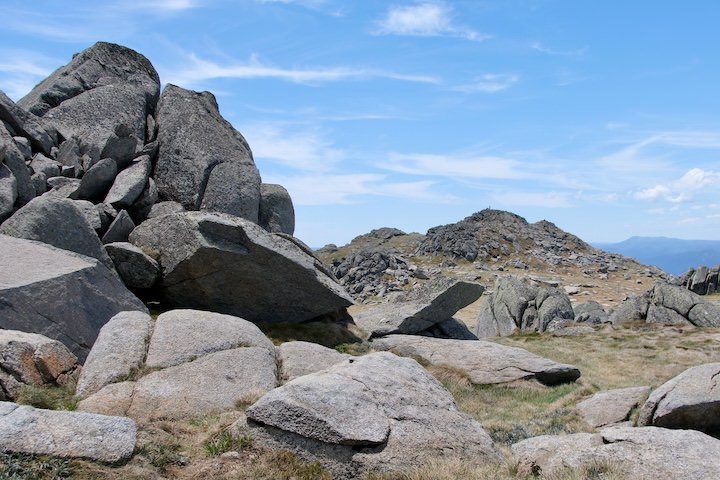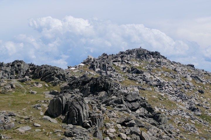 The track sidled Muellers Peak, leaving the grass behind and entering a big patch of boulders. We were catching up to a solitary walker wearing a blue jacket. At a point where the track was vague and confusing he turned down into the valley, but I knew the track stayed up high, and soon managed to regain it. We stopped for a break, and I had a big drink since I was feeling quite thirsty.