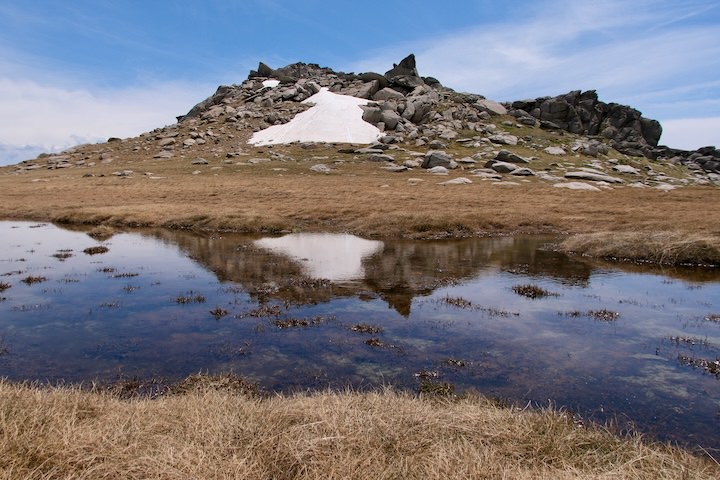 Clouds were piling up from the west over the Main Range, turning my thoughts to the weather forecast and our wide open tent, so we made a start on our return. For variety, we took a different route back, winding between the rocks on the western side of the ridge, and giving us a great view of the rugged terrain. Nearing Townsend, I steered us past some pools, which presented a particularly nice view of the snowy peak with its reflection.