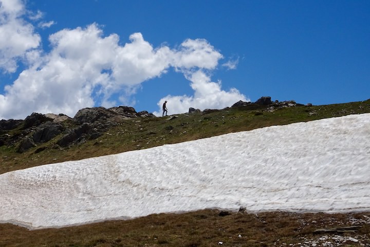 The only way to find out was to go and look, so we kept going. I fervently hoped we wouldn’t need to come back up. At a saddle we were confronted with a huge snowbank running right across the ridge, too tall and steep to climb over. This was an obstacle I hadn’t expected in summer! It felt like the bad omens were piling up for this camp.
