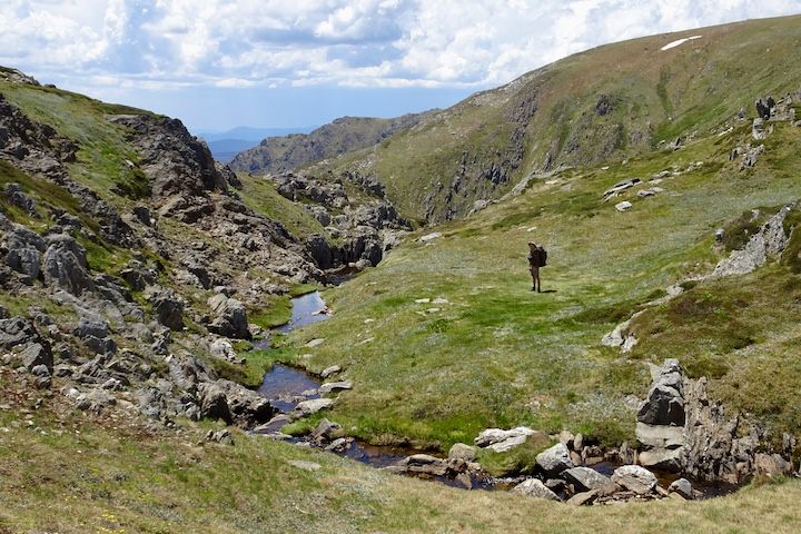 We hadn’t descended far when we came to a fence enclosing much of the Strzelecki Creek valley. A notice informed us it was an exclusion zone, set up in an attempt to control a hawkweed1 infestation. Disappointment filled me: the campsite I was aiming for further down the ridge was right next to the creek. If it was fenced off I didn’t know what we could do instead, with very limited options for placing a tent and finding water in the unfenced area.