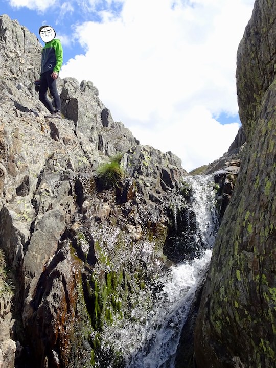 This creek flows past the Opera House hut2, dropping 900 metres in a mere 2·5 kilometres to reach it. In my planning for this walk I’d tried to include a visit to the hut. Despite knowing how difficult the routes to it were in theory, it was another thing to stand here and witness exactly how steep and deep the valley was. The idea of walking it was horrifying.