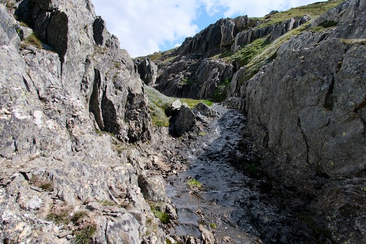 We descended to the saddle, then left the track behind to continue straight ahead up towards Twynam. The climb didn’t go on too long, and I was spurred on by thoughts of reaching camp. Where the ridge running down to The Sentinel branched off to the left we followed it, picking up a foot pad. The peak looked impressive from this angle, standing alone at the edge of the range.