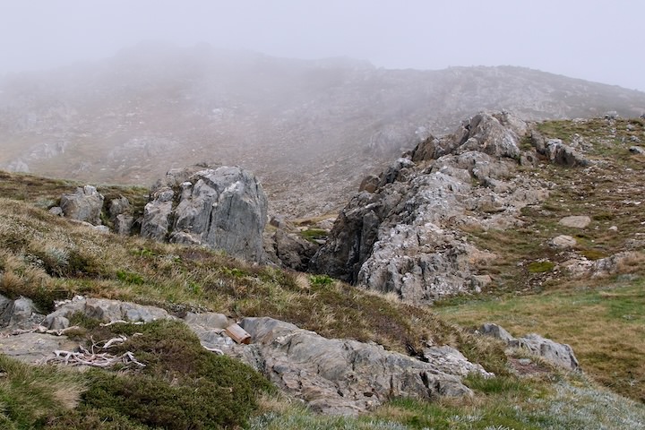 We hadn’t long returned from our explorations when a bank of thick fog rolled in from the head of the valley, against the prevailing wind. In no time it had blotted out the sun, and brought a chill to the air. Earlier when I’d been struggling on the trail, the thought of lying down and resting was the lure that kept me going. So I was more than ready for a snooze, since sitting outside had lost its attraction. After a comfortable hour under my sleeping bag, I got up to make dinner.