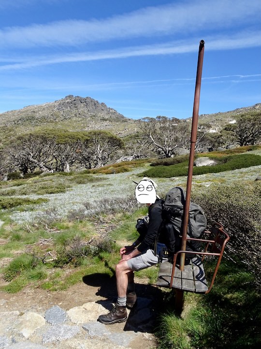 On the steel walkway we turned south towards the top of the chairlift. Above us to our right was the end of the Rams Head Range, and in fact what we were looking at was the rocky rim of the valley we overlooked from our first night’s camp.