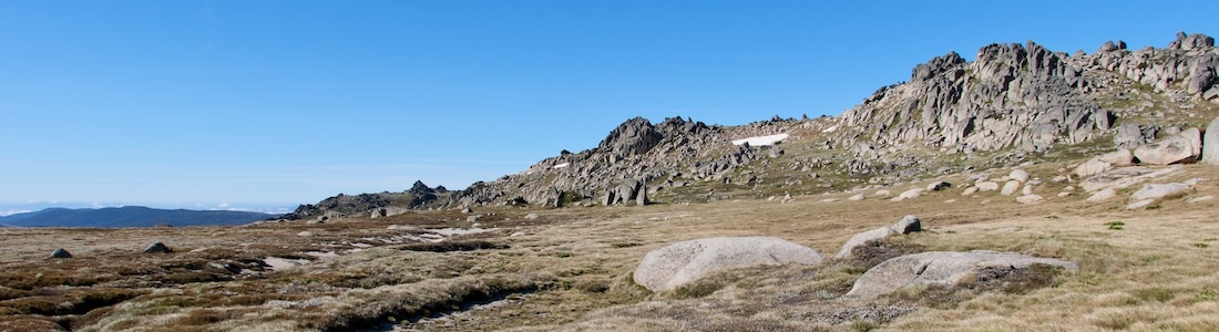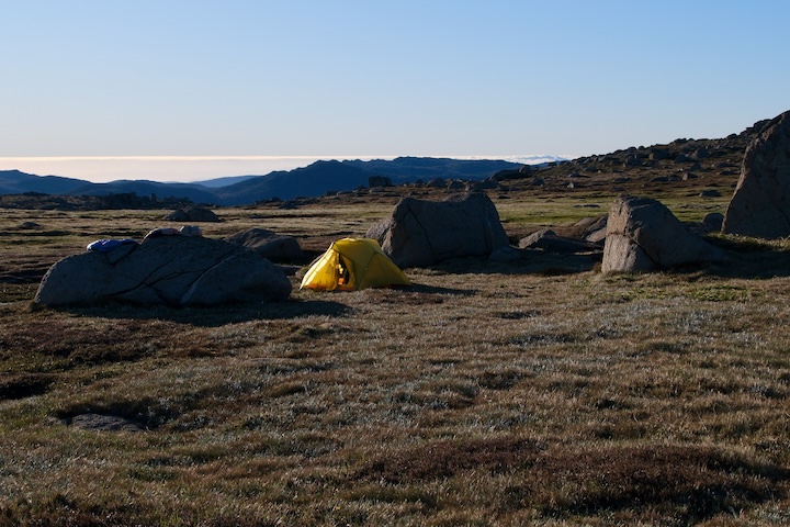 The night had been calm and quiet, for which I was grateful since this camp was our most exposed yet. I’d slept well, perhaps once more helped by being so tired. When I woke the sun was already shining on the tent, and groundlarks1 were chirping. The sky was flawless blue. Northward the Main Range stood out in perfect clarity, while the valleys below us to the south were filled with cloud.