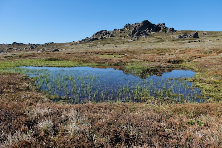 A little way above the top station of the Kosciuszko chairlift we arrived at the junction for the track down to the Cascades trailhead3. We walked a short way off the main track and found a quiet spot with good views for a tea break. A solitary raven strutted around the grass nearby, hunting for insects.