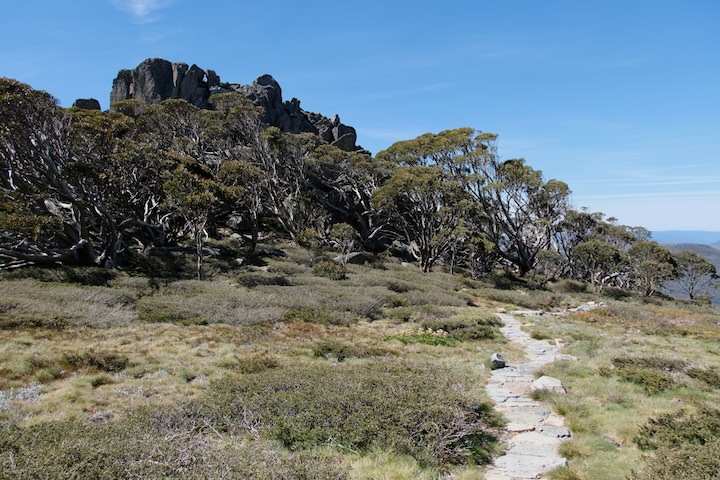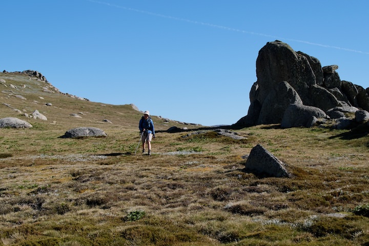 The track surface was laid with granite rocks which, though durable and blending nicely with the landscape, weren’t pleasant to walk on. They were irregular in size and shape, making it difficult to stride out. Further down we passed a work site where more of the track was being laid this way. The rocks were flown in by helicopter in huge bags and, given the amount of such track we’d seen, hundreds of tonnes of rock was being used. The NSW Parks and Wildlife Service must be spending a fortune on what is a relatively minor track. The contrast to back home was stark: Parks Victoria is so crippled that any track temporarily closed either takes years to reopen, or remains closed forever.