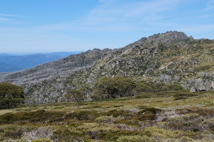 With a large descent required to reach the road, I’d naïvely assumed the track would simply drop straight down. So I was surprised, not to mention disappointed, to find the track heading uphill, albeit gently. It skirted the southern side of the Rams Head Range, and crossed a couple of tiny streams running down from the heights. With the day so clear, the views went for miles into the blue distance.
